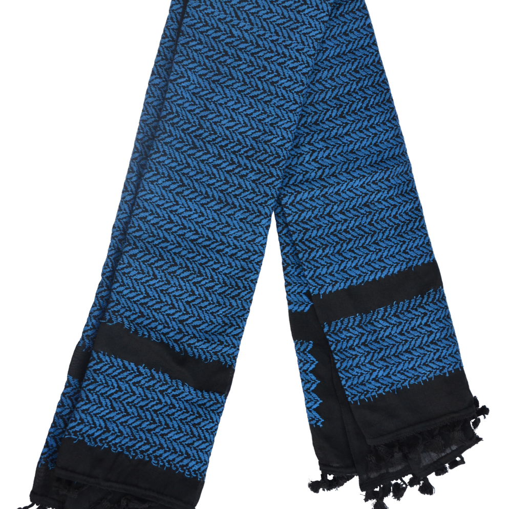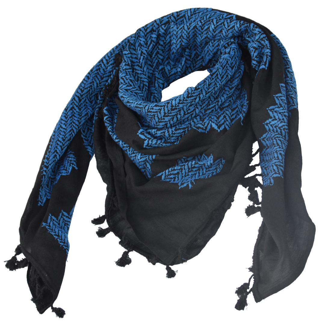 This is even more beautiful in person. The embroidered pattern is a lovely shade of blue and has a subtle shine to it. It adds a pop of color to any neutral outfit. I love the unmatched quality of Hirbawi kufiyas and cherish any opportunity to support Palestinian livelihoods and show my solidarity.